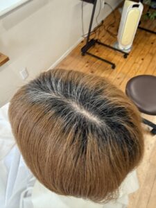 黒髪を明るくする効果と、白髪を染めるという効果を同時に行っていきます。白髪が多い方に比較的に向いていてお顔の色が少し和らいで見える効果もあります。